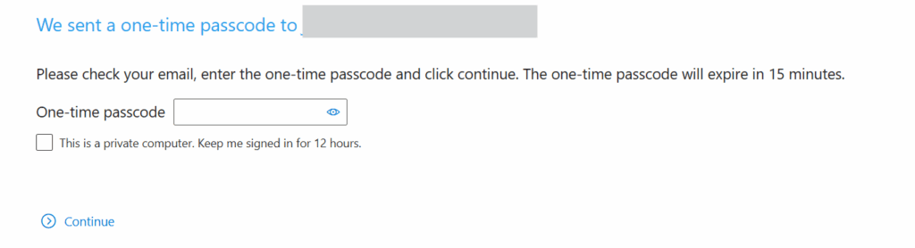 Select your verification choice. If you selected to receive a one-time passcode, retrieve it from your email and enter it in the screen below. Click continue.
