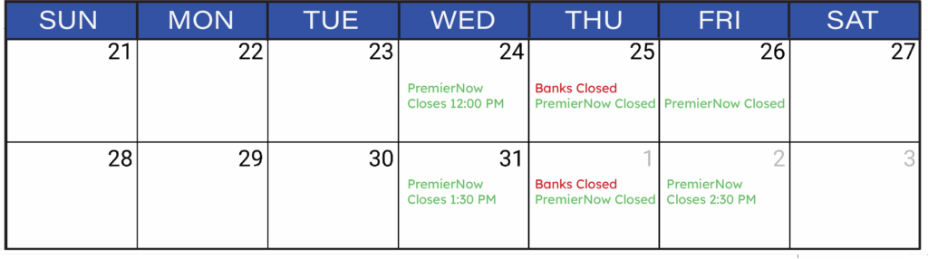 Bank Closures & PremierNow Holidays